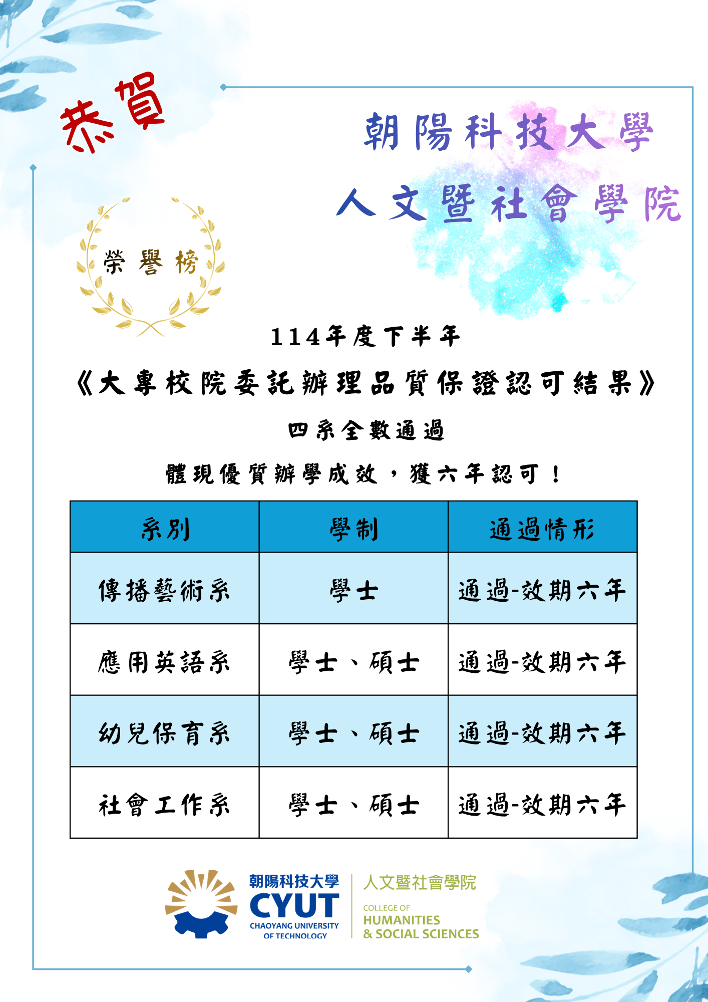 恭賀!本院各系全數通過114年度下半年《大專校院委託辦理品質保證認可》